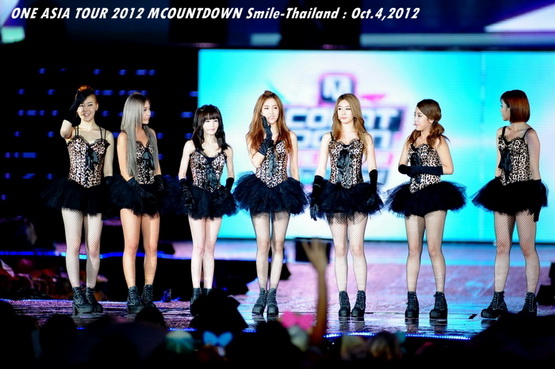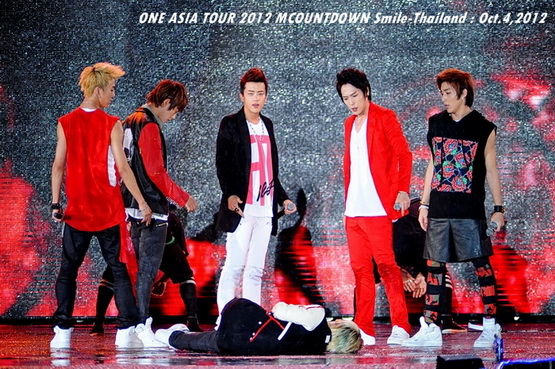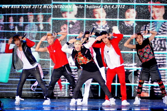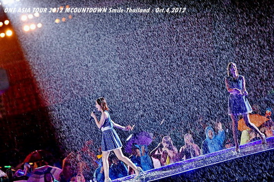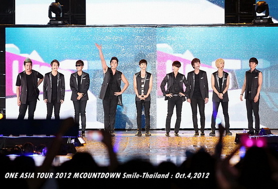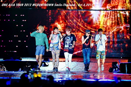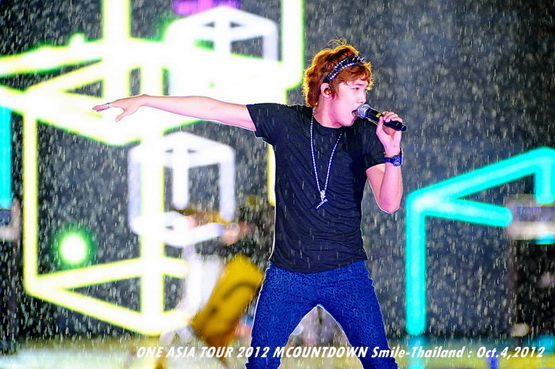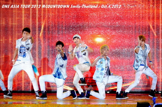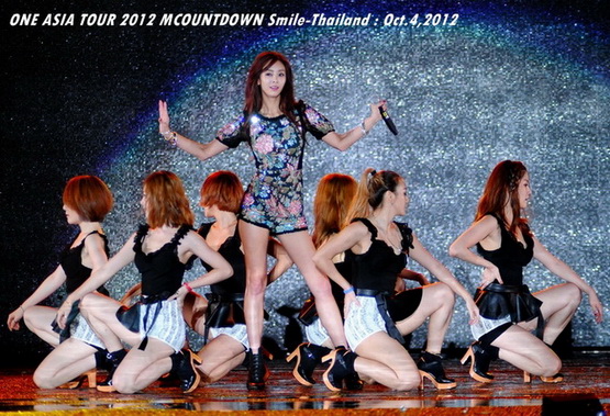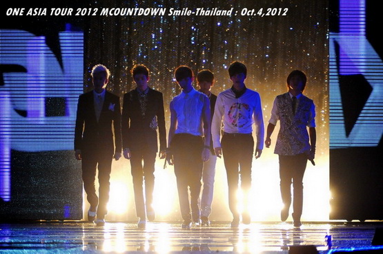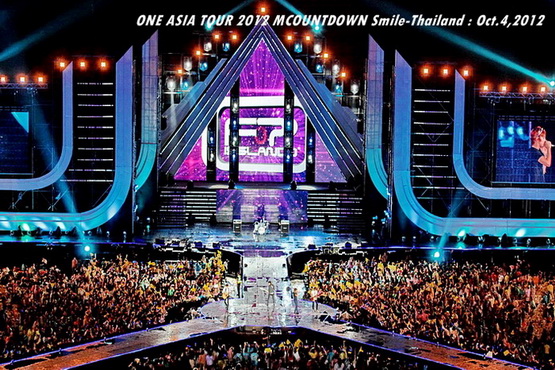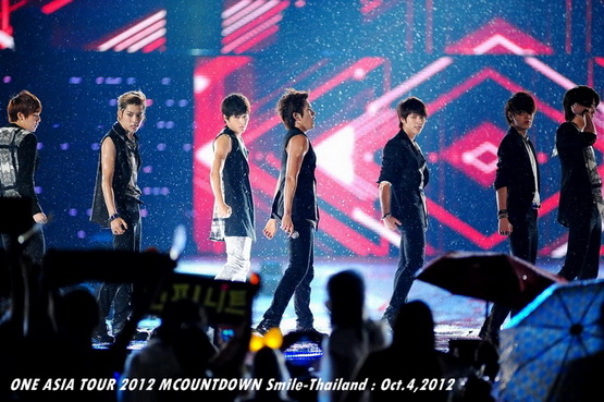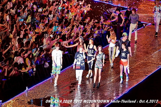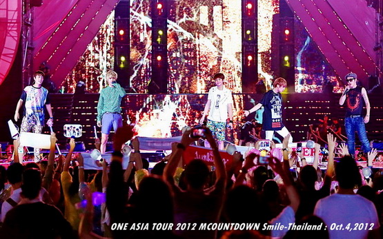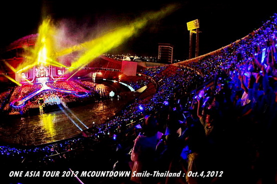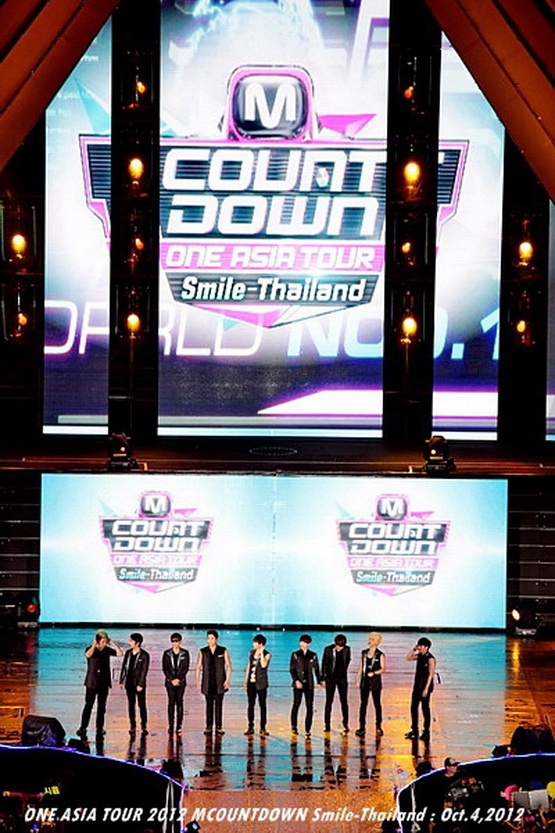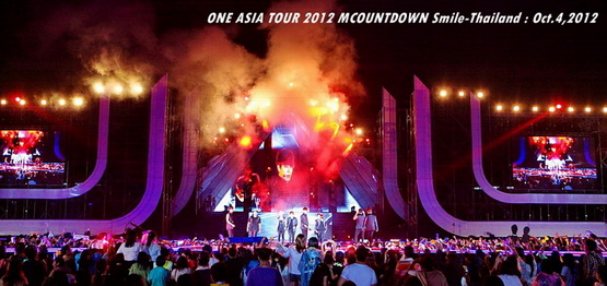 วันพฤหัสบดีที่ 4 ตุลาคม 2555 ที่เพิ่งผ่านไปหมาดๆ จึงถือเป็นฤกษ์งามยามดี สำหรับการโคจรมาพบกันระหว่างไอดอลเกาหลีระดับท็อปสตาร์ 15 ศิลปินและเหล่าสาวก K-POP ชาวสยามประเทศ ในงานมหกรรมคอนเสิร์ต ''วัน เอเชีย ทัวร์ 2012 เอ็มเคาท์ดาวน์ สไมล์-ไทยแลนด์'' (ONE ASIA TOUR 2012 MCOUNTDOWN Smile-Thailand) ณ สนามราชมังคลากีฬาสถาน หัวหมาก โดยการแสดงเริ่มต้นขึ้นที่เวลา 19:10 น. ท่ามกลางสายฝนโปรยปราย ซึ่งทำเอาชาวเค-ป็อปได้เปียกปอนไปตามๆ กัน ไม่ว่าจะเหล่าผู้ชมชาวไทยและต่างประเทศกว่า 3 หมื่นคน รวมถึงเหล่าไอดอลจากแดนกิมจิก็ล้วนชุ่มฉ่ำกันถ้วนหน้าทั้ง 15 ศิลปิน